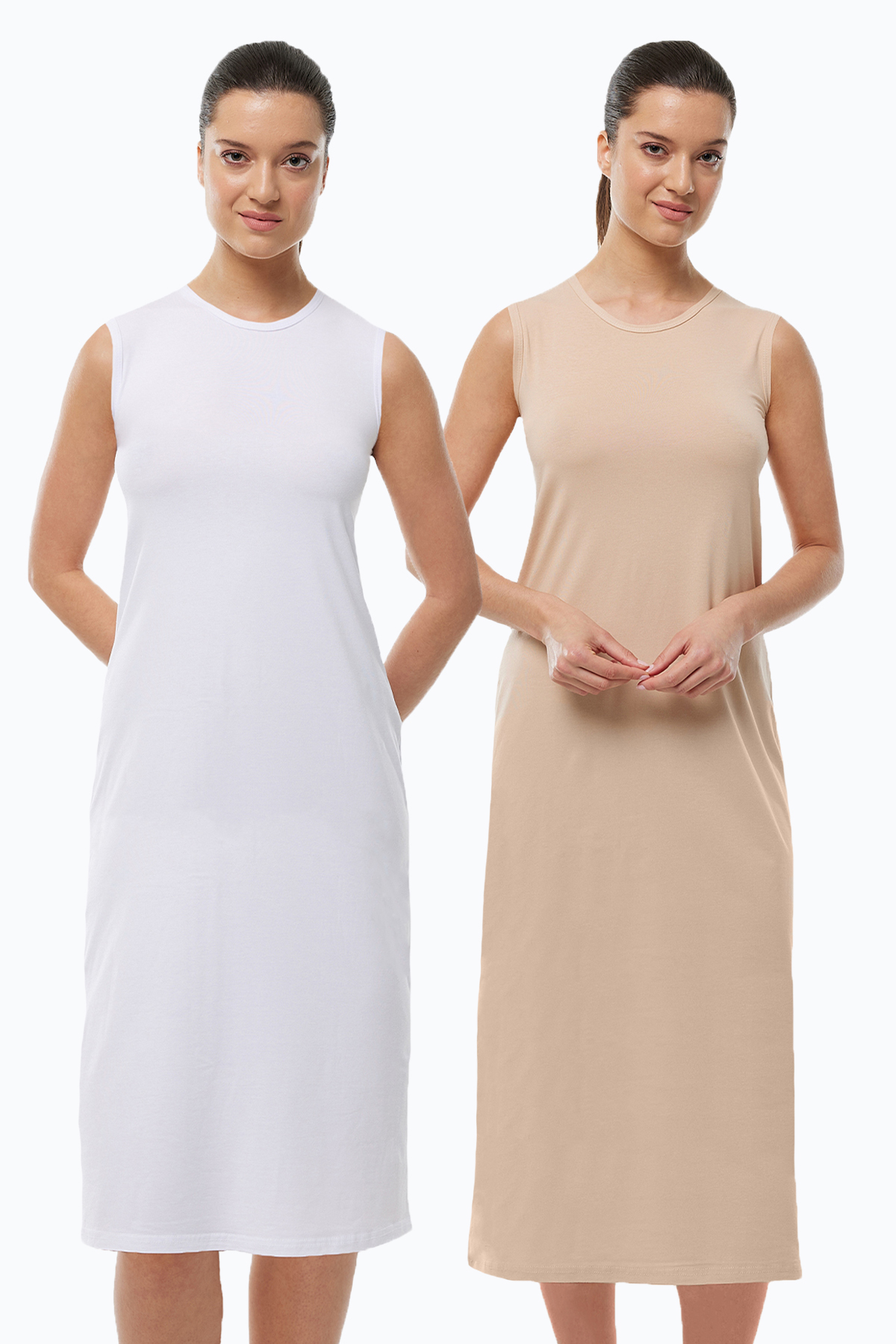 Malabadi Kadın Beyaz Ten Rengi 2 li Set Uzun Kolsuz Elbise Astarı Modal Kombinezon 2M1049